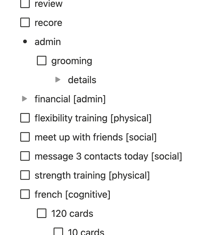 - Meta (job, daily reviews, admin, reminders, etc.)
